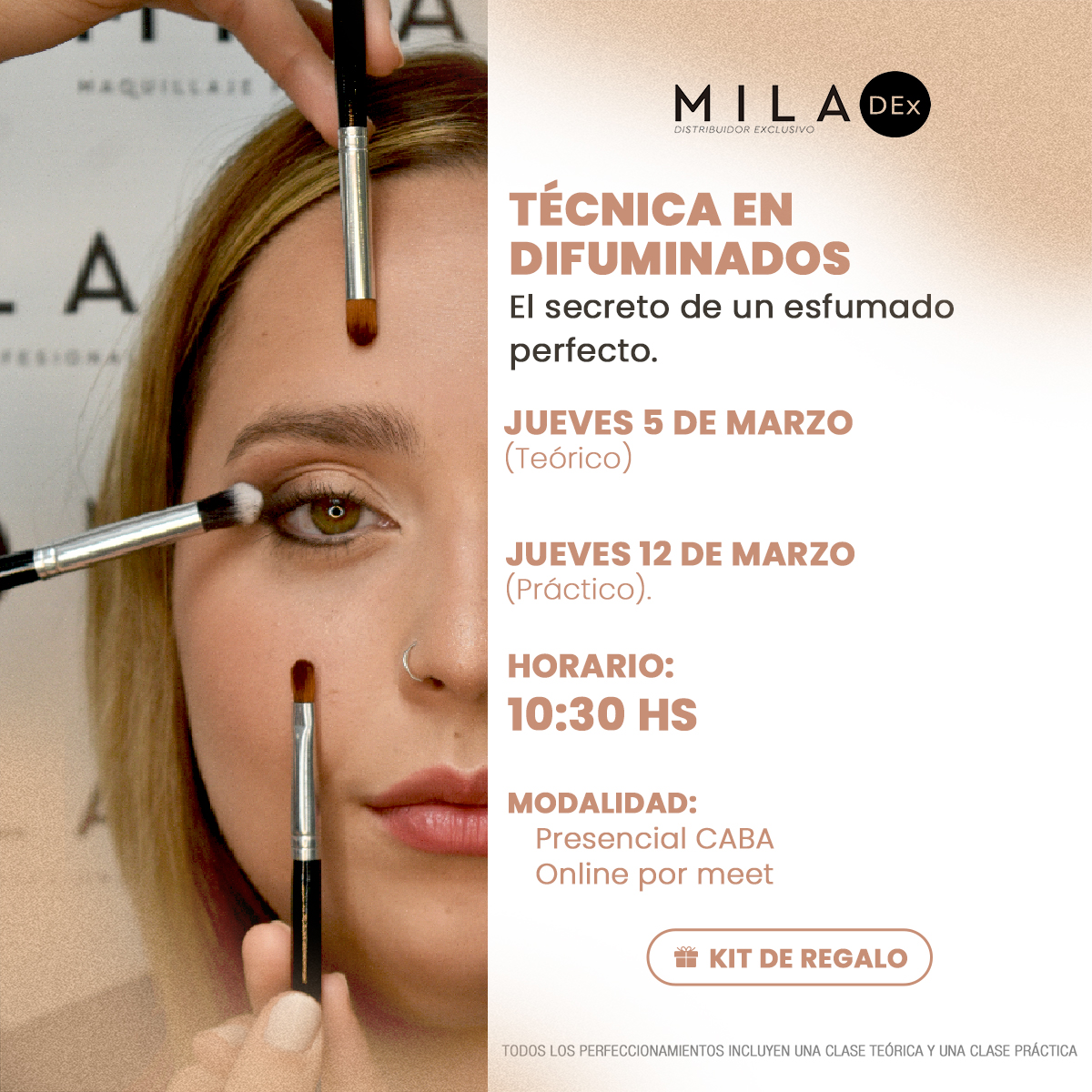 ¿Queres llevar tus maquillajes a otro nivel? ¡Entonces este perfeccionamiento es para vos! ⏱DURACION: Hora y media aproximadamente cada clase. MODALIDAD: 👩🏻‍🏫 Presencial en Av. Corrientes 1675 - CABA 💻 Online: Vía Meet en simultaneo. 🎁KIT DE REGALO: Paleta de sombras neutra (Art. 5006) Pincel Blender chico (Art. MM-06)